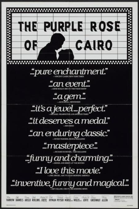 喜剧片开罗紫玫瑰讲述了:三十年代美国经济大萧条,市面上一片荒芜。家庭主妇Cecilia(米亚·法罗 Mia Farrow 饰)白天应对沉闷的服务生工作(由于经济崩溃 ,很快也失去这份工作),晚上面对毫无情趣的丈夫。身为狂热影迷的她日日走进影院观看一部叫《开罗紫罗兰》的电影,熟习到连台词表情都能记住,电影里没有经济萧条,电影里是上流社会的宴席与取乐。这日奇怪的事发生了,戏里面的男主角Tom(杰夫·丹尼尔斯 Jeff Daniels 饰)从荧幕上走了下来!直接走到Cecilia面前,和她私奔。而电影里的人物也跟着议论纷纷,剧情不按剧情走,而变成了讨论会。Cecilia与Tom去游乐园,互诉衷情,虽然一开始很浪漫,但后来发现这并不能填饱肚子,男主角Tom在现实中的扮演者Gil(杰夫·丹尼尔斯 Jeff Daniels 饰)也出现了 ,同样为了夺得Cecilia芳心与Tom展开比拼决斗。这个荒谬的闹剧将会如何结束?走进戏院观看电影的确会让人暂时忘怀现实世界的不快。