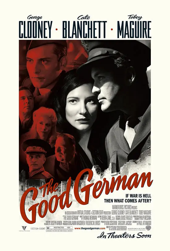 《德国好人》是史蒂文·索德伯格导演的作品,发行于2006年(美国),由乔治·克鲁尼,凯特·布兰切特,托比·马奎尔,戴夫·博沃,罗宾·薇格特等主演,光棍影院为大家提供德国好人完整版免费在线观看,能在手机和电脑上流畅观看德国好人高清版(正片英语,德语,俄语原声),同时还支持是手机投屏。 剧情片德国好人讲述了:杰克(乔治·克鲁尼 George Clooney 饰)是一名来自美国的战地记者,充满了鲜血和硝烟的一战结束后,杰克终于能够重新回到前线,报道波茨坦会议的相关新闻。不过,杰克此行还有另外一个十分重要的目的,那就是寻找与他曾经有过一段短暂情缘的德国女子莱娜(凯特·布兰切特 Cate Blanchett 饰)。奇迹般地,杰克和莱娜重逢了,之后,杰克得知莱娜那失踪已久的丈夫艾米尔(克里斯蒂安·奥利佛 Christian Oliver 饰)被卷入了复杂的政治斗争之中。 一名美国士兵被枪杀的案件让杰克意识到事情必有蹊跷,他几次想要调查,却遭到了军方的阻挠和警告。与此同时,杰克的好友帕特里克上尉(托比·马奎尔 Tobey Maguire 饰)所表现出的异常举动亦传达出了某些秘密的讯息。